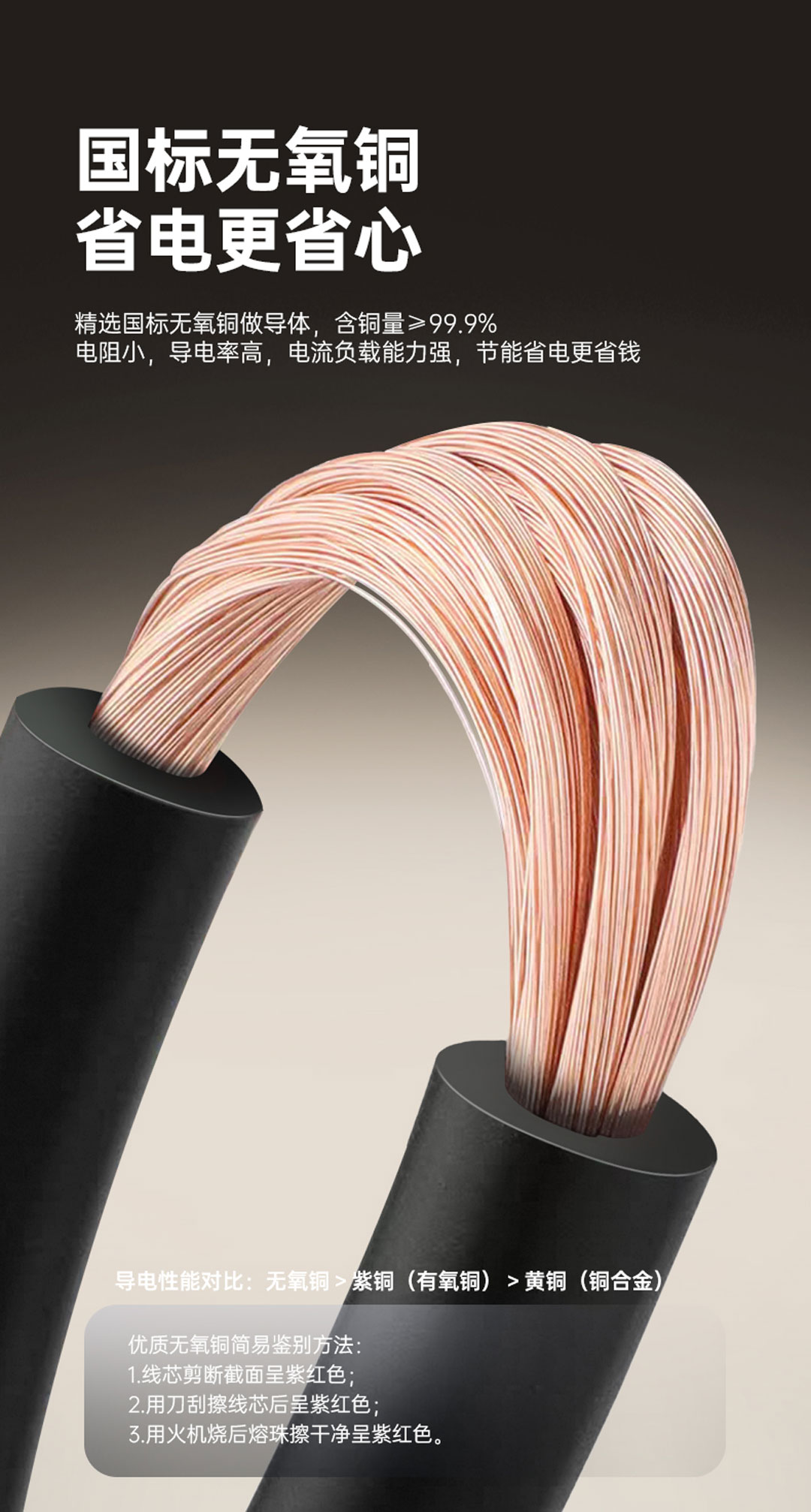 含铜量≥99.9%,杂质少电阻小,导电性能好,强电流负载能力,